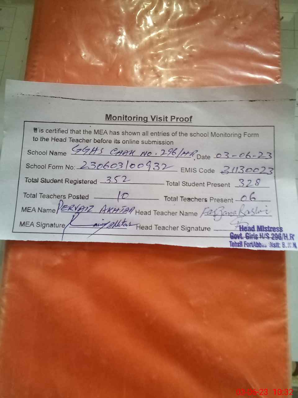 | EMIS Code: 31130023 | Name of School: GGHS CHAK NO 296 HR | |||