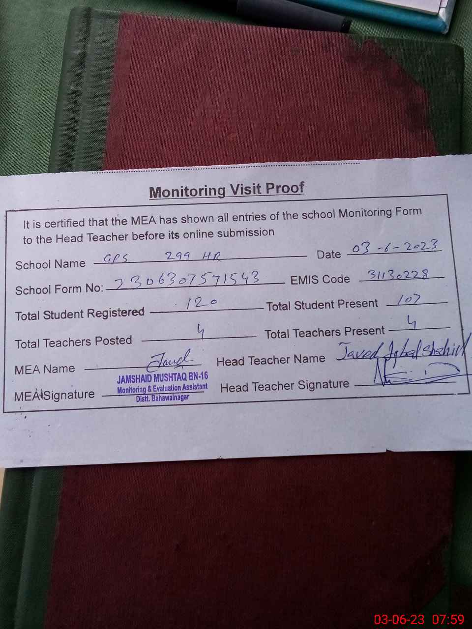 | EMIS Code: 31130228 | Name of School: GPS CHAK NO 299 HR | |||