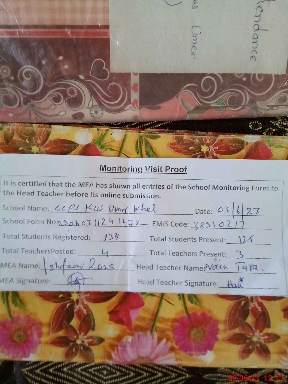| Attendance Register | Head Teacher | MEA with School | Visit Proof |