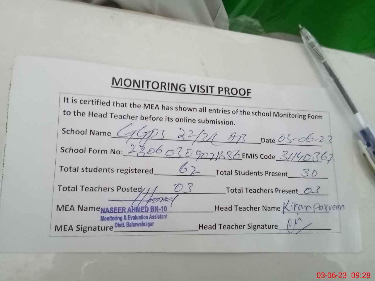 | EMIS Code: 31140367 | Name of School: GGPS CHAK NO. 22/3-R (AB) | |||