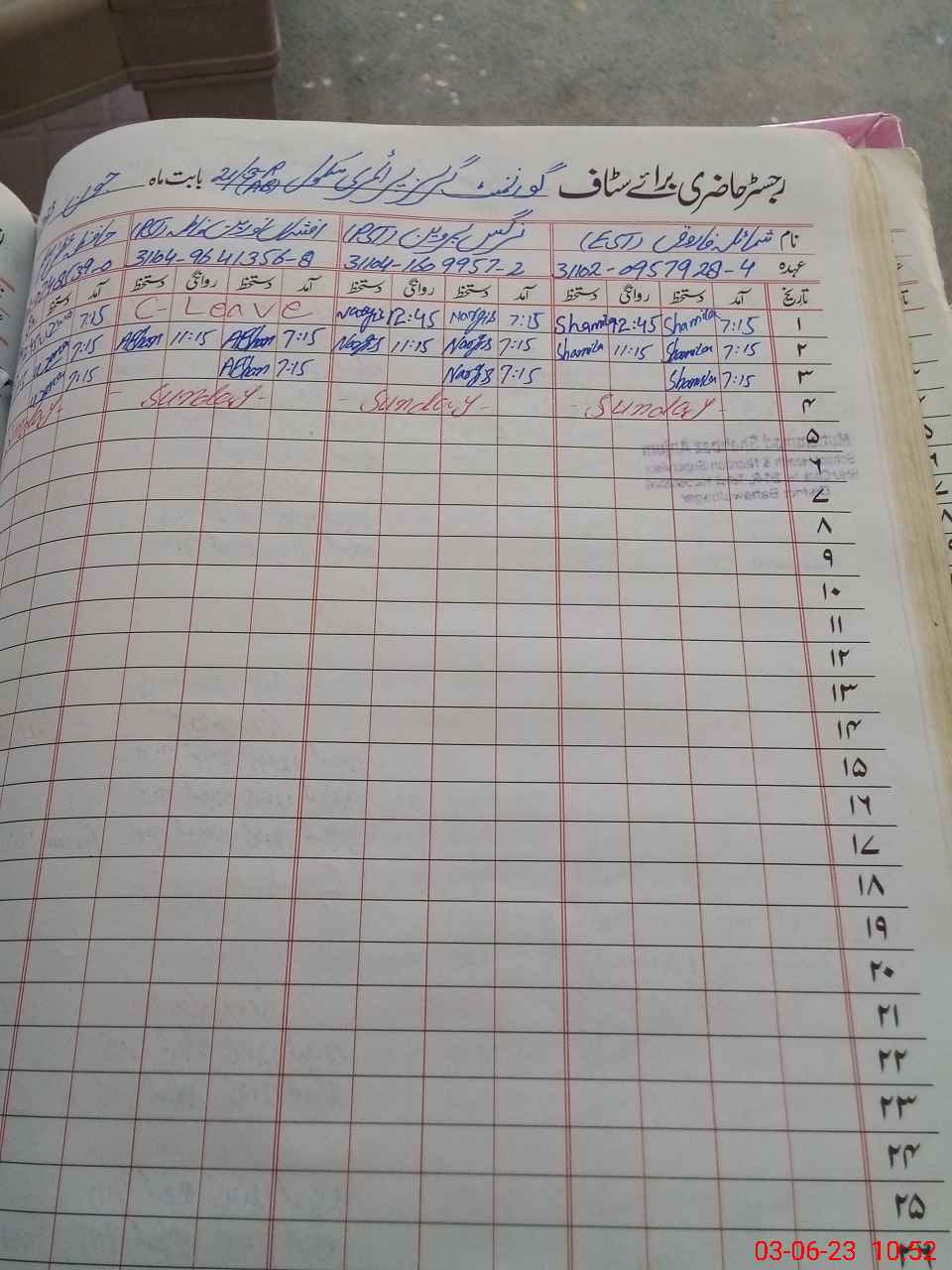 | CNIC | Full Name | Designation | R/C | Absence During Last Calender Month |