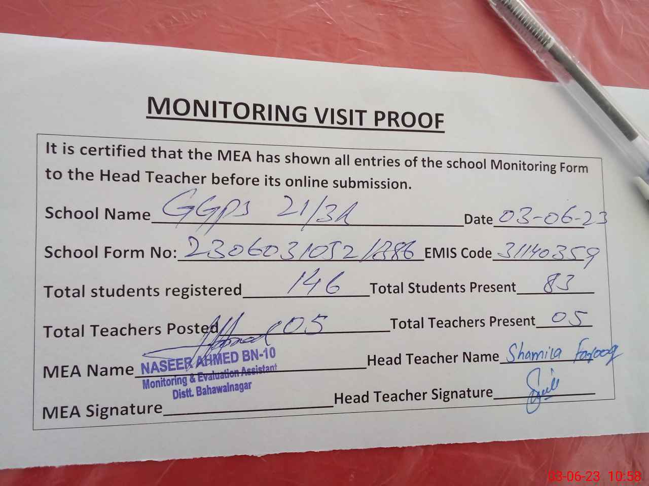 | Attendance Register | Head Teacher | MEA with School | Visit Proof |