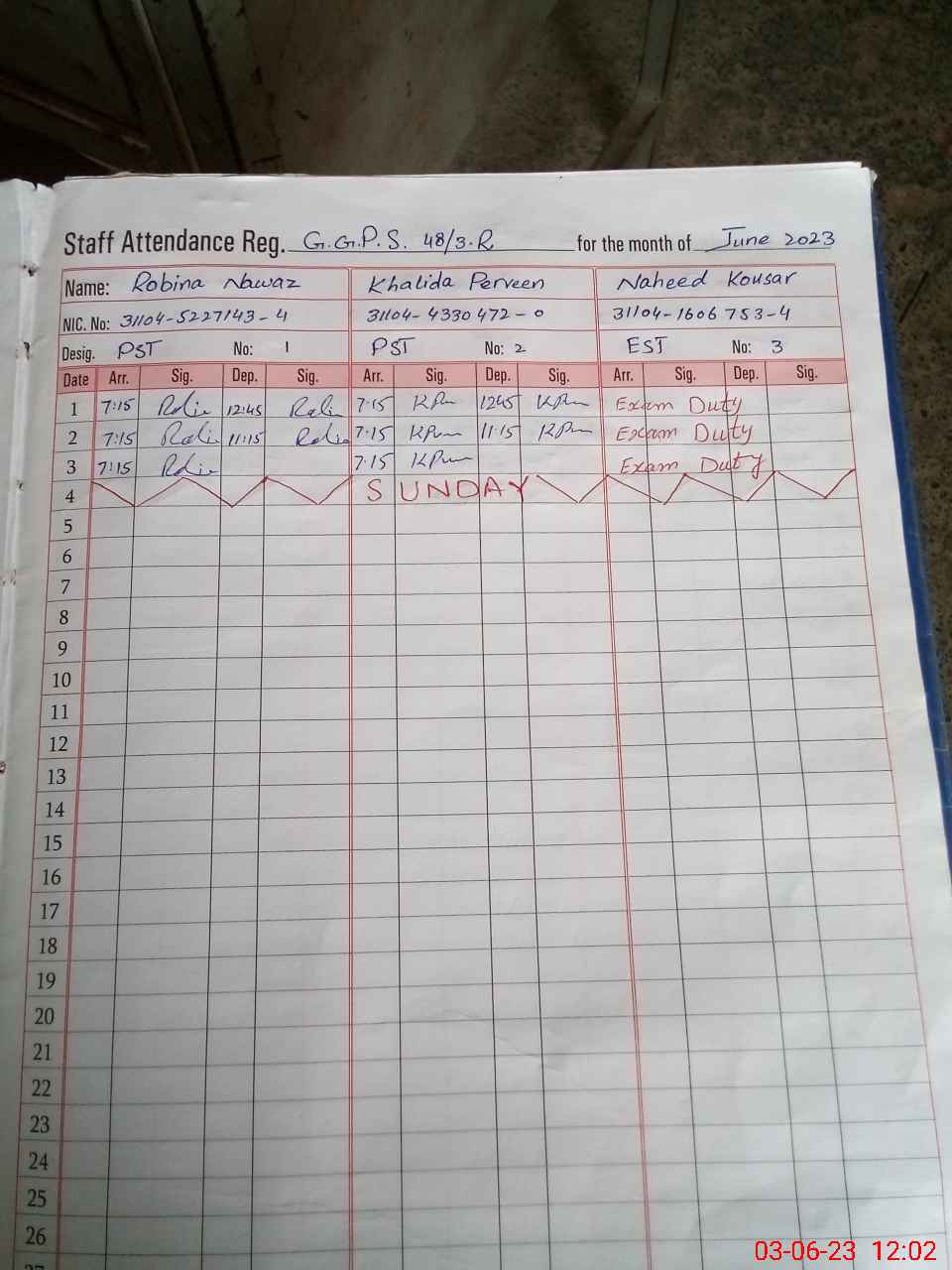 | CNIC | Full Name | Designation | R/C | Absence During Last Calender Month |