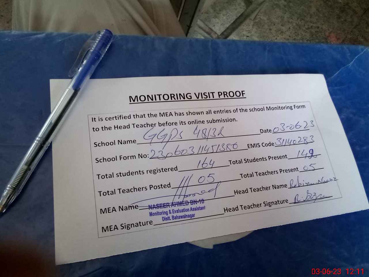 | Attendance Register | Head Teacher | MEA with School | Visit Proof |