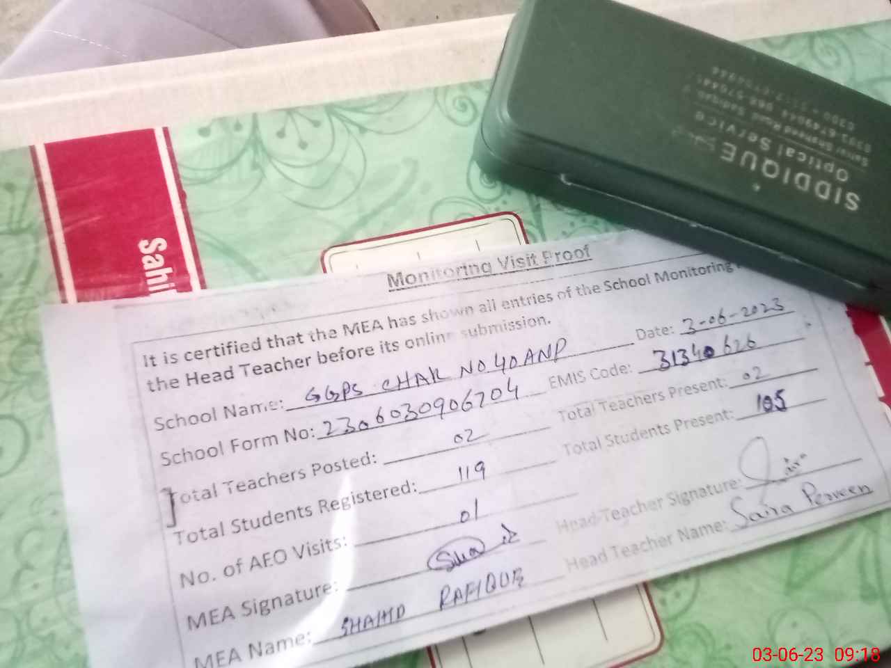 | Attendance Register | Head Teacher | MEA with School | Visit Proof |