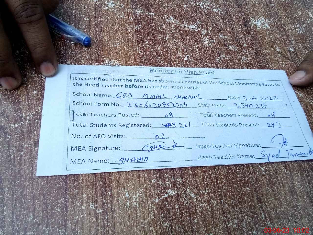 | Attendance Register | Head Teacher | MEA with School | Visit Proof |
