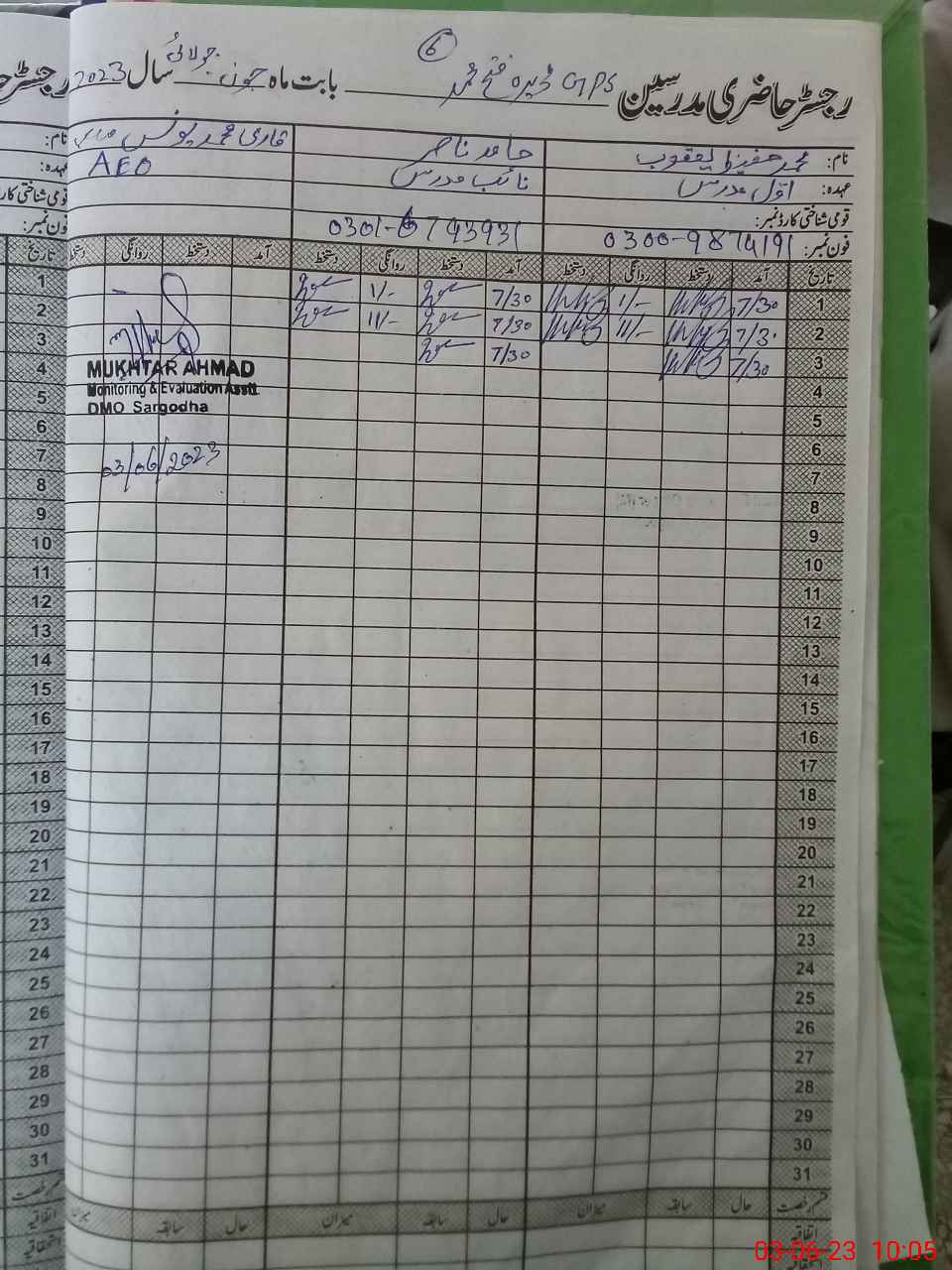 | Name: HA**** NA**** Designation: (School Headmaster's/Headmistress's) PST Phone/Cell Number: 03**** |