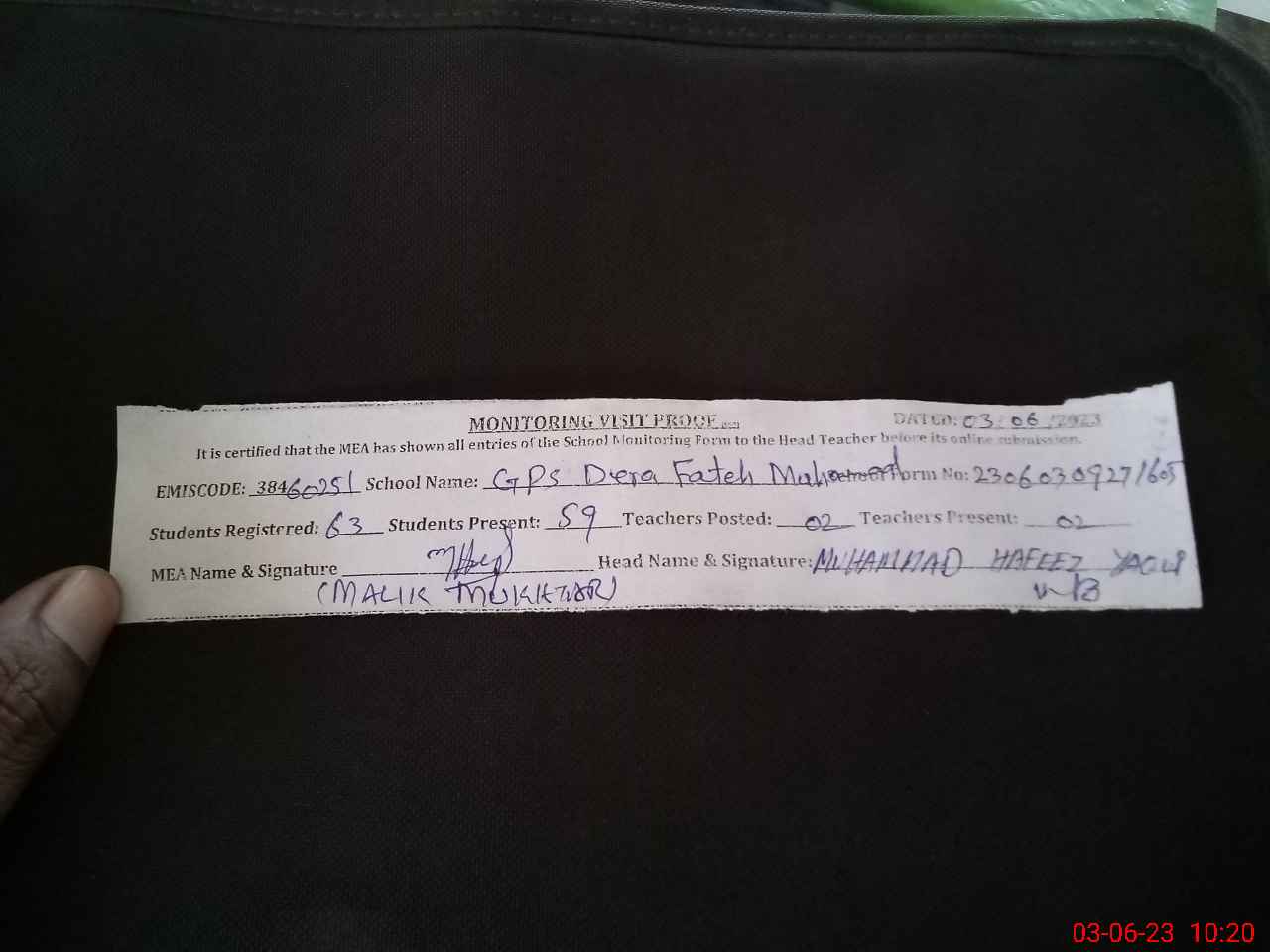 | Attendance Register | Head Teacher | MEA with School | Visit Proof |