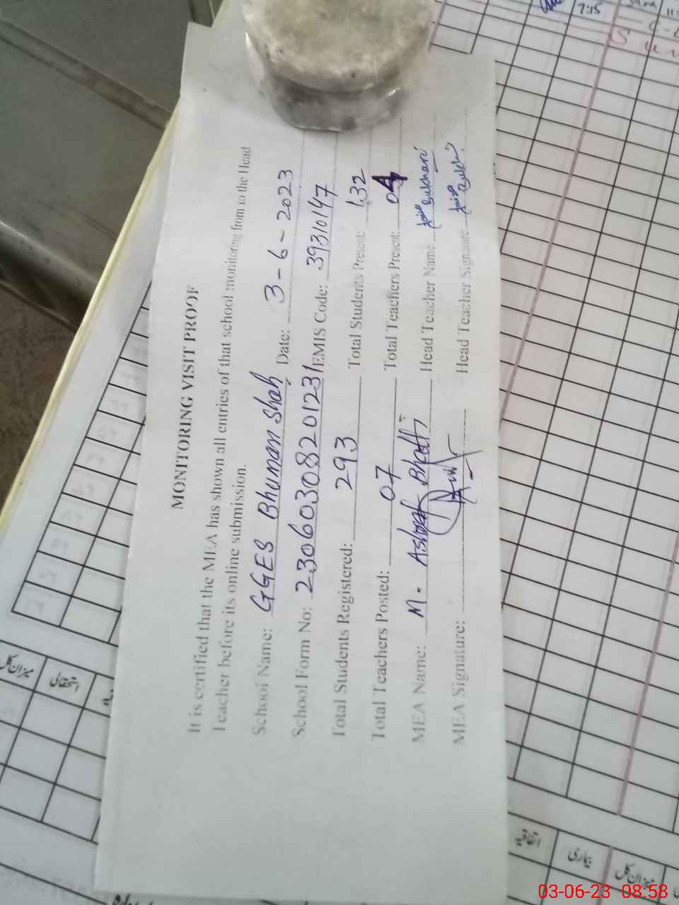 | Attendance Register | Head Teacher | MEA with School | Visit Proof |