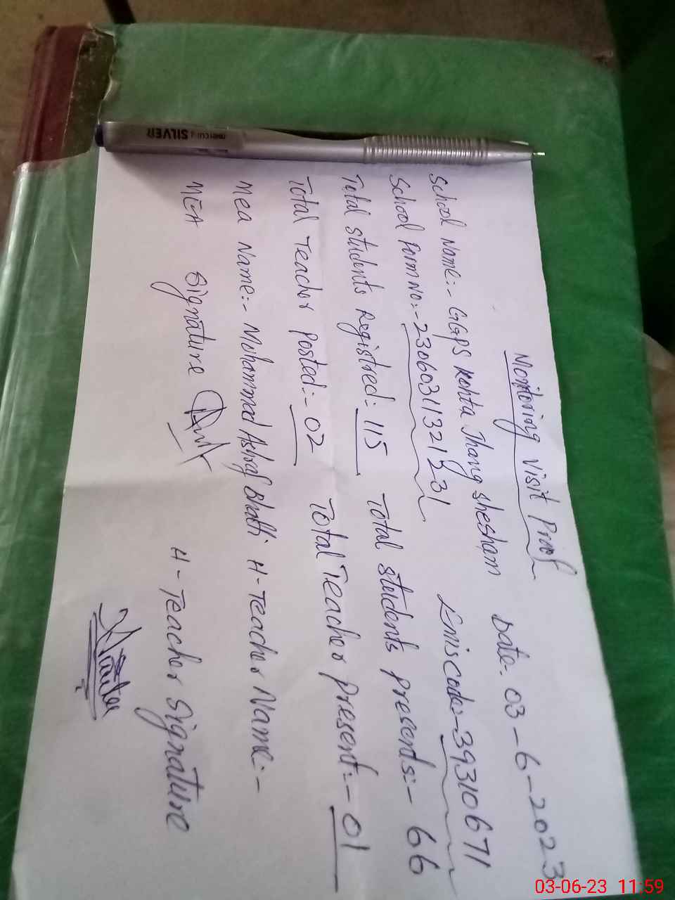 | Attendance Register | Head Teacher | MEA with School | Visit Proof |