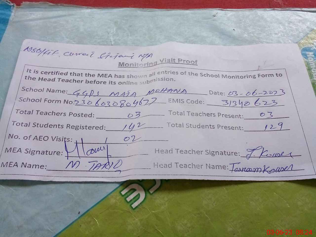 | Attendance Register | Head Teacher | MEA with School | Visit Proof |