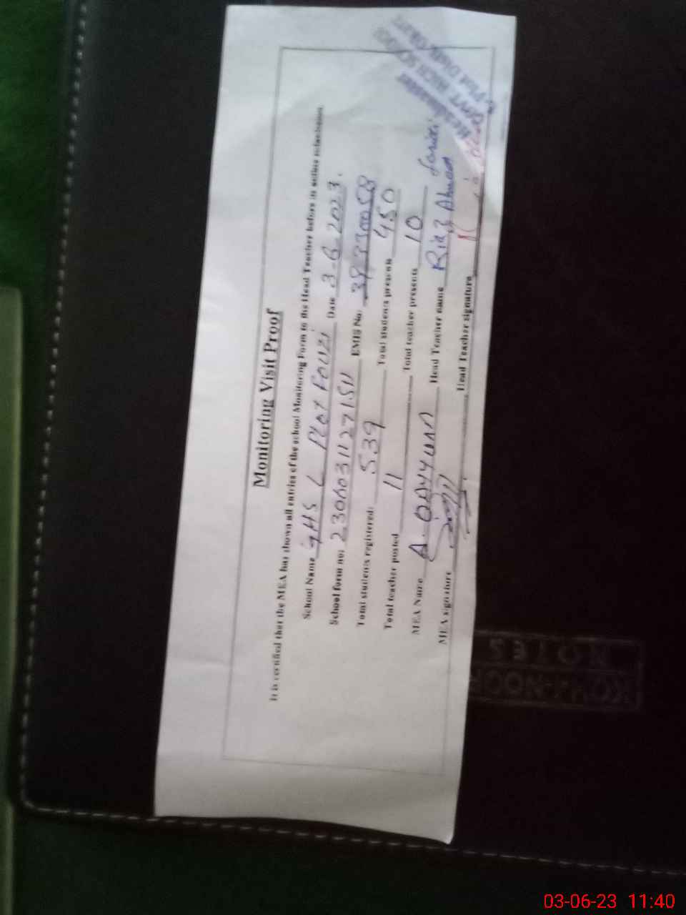 | Attendance Register | Head Teacher | MEA with School | Visit Proof |
