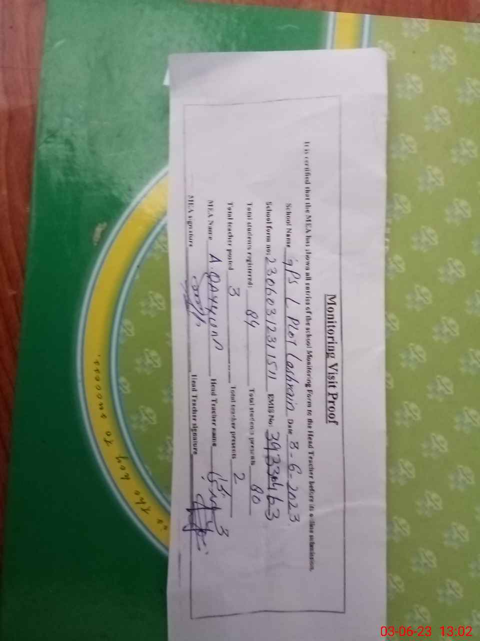 | Attendance Register | Head Teacher | MEA with School | Visit Proof |