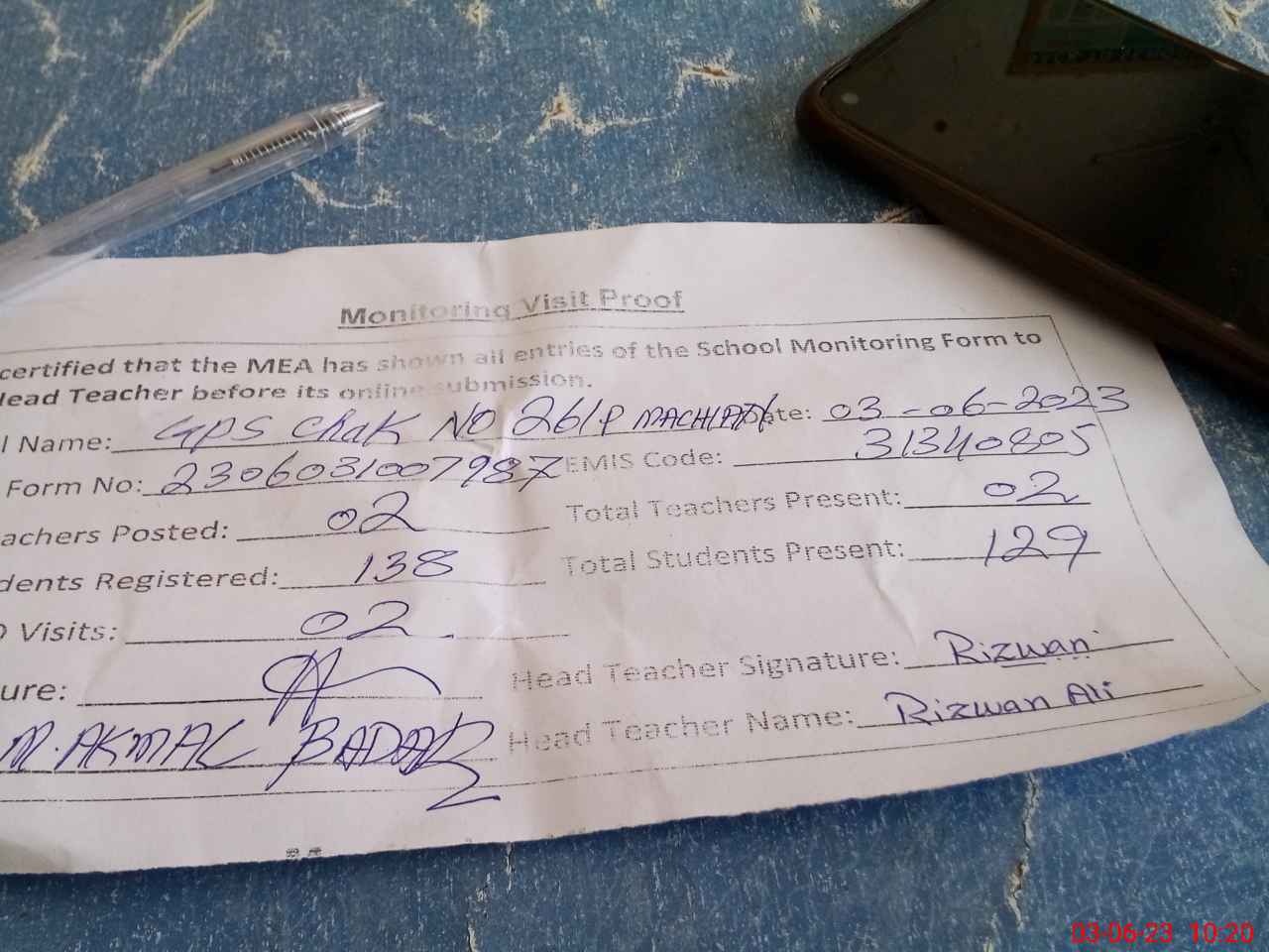 | EMIS Code: 31340805 | Name of School: GPS CHAK NO. 261/P (MACHAIN) | |||