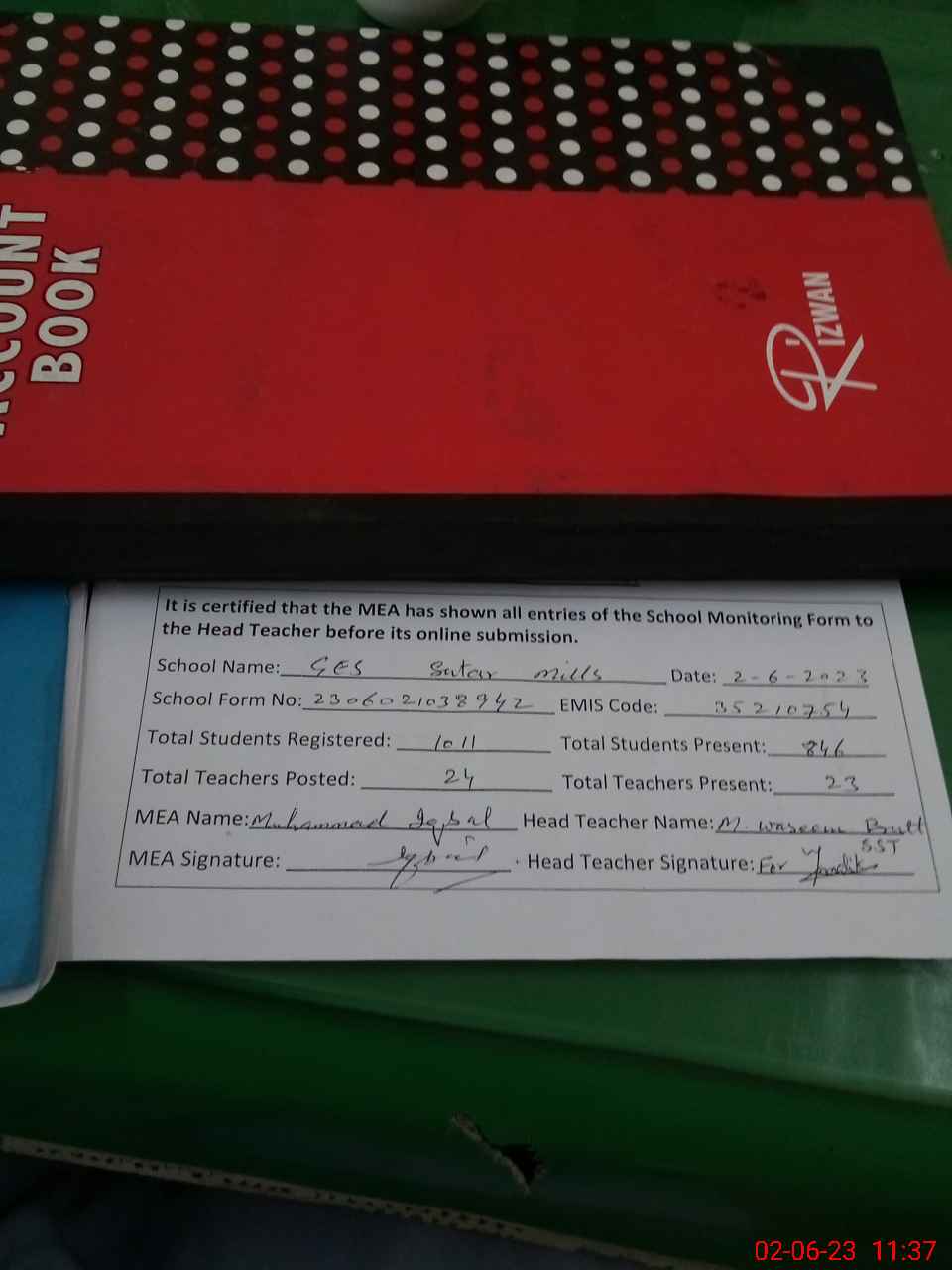 | Certified that this School was Inspected by the Undersigned MEA/DMO Today and the Information Stated Above is as Per Record. | |||||