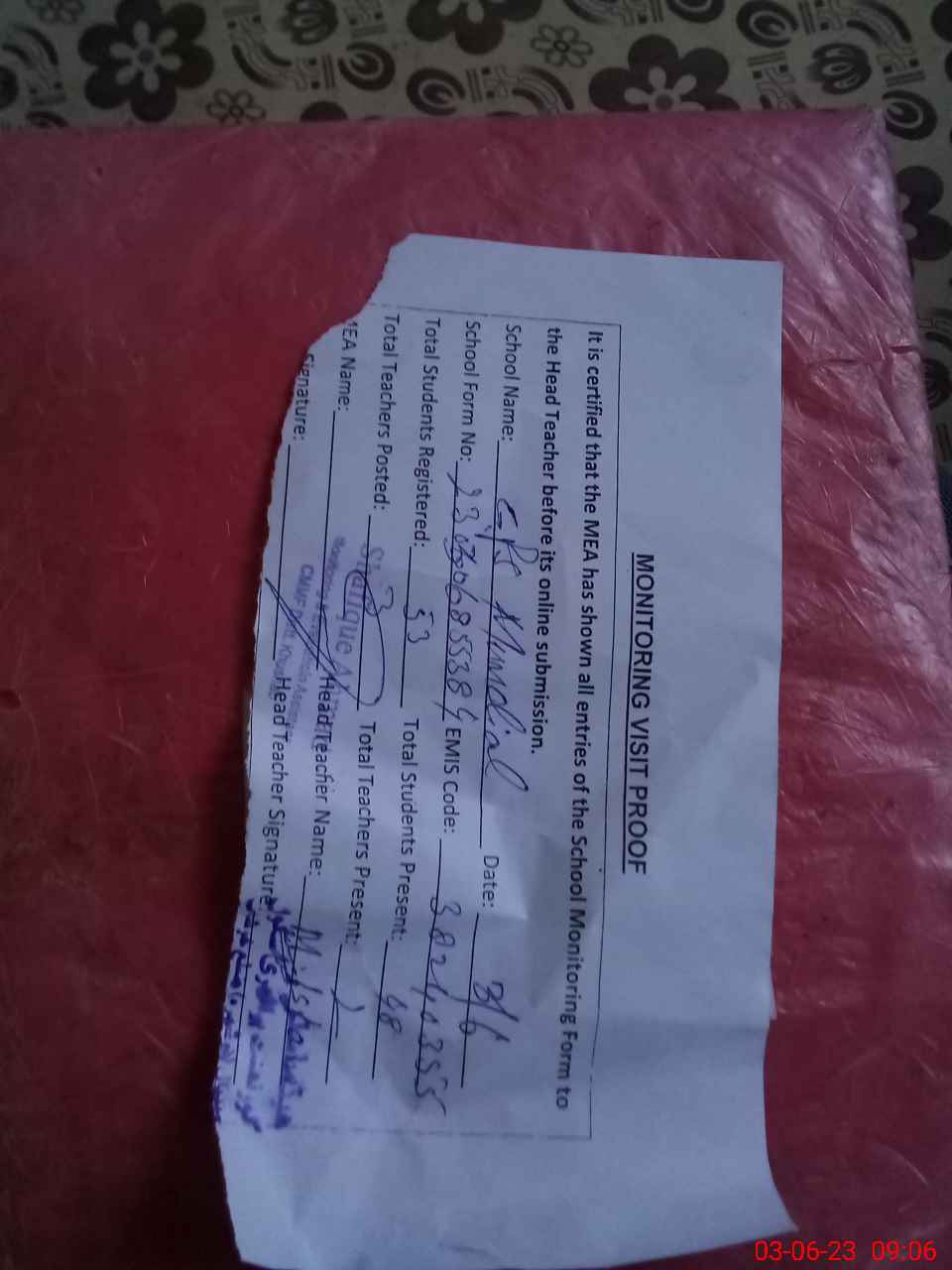 | Attendance Register | Head Teacher | MEA with School | Visit Proof |