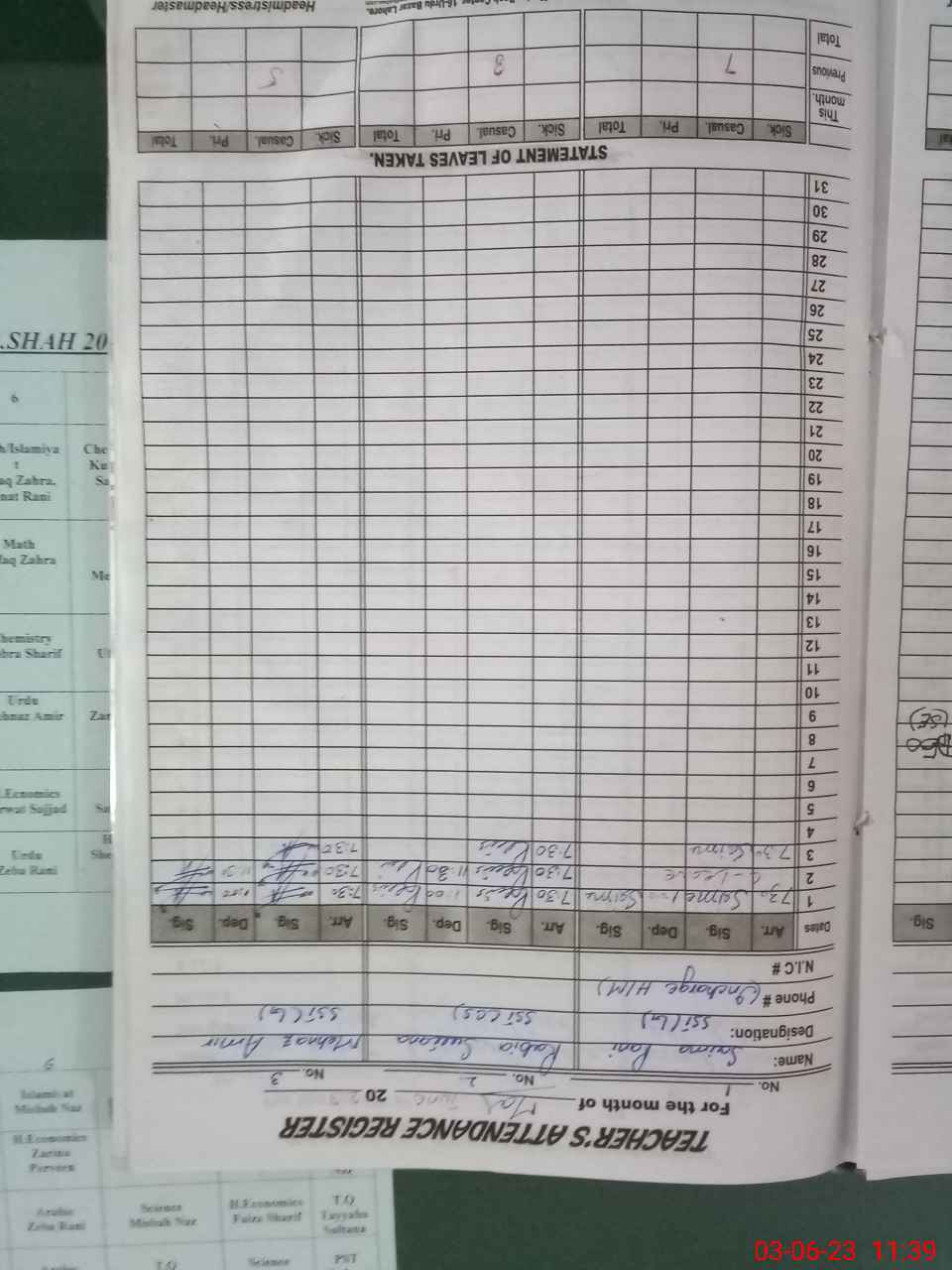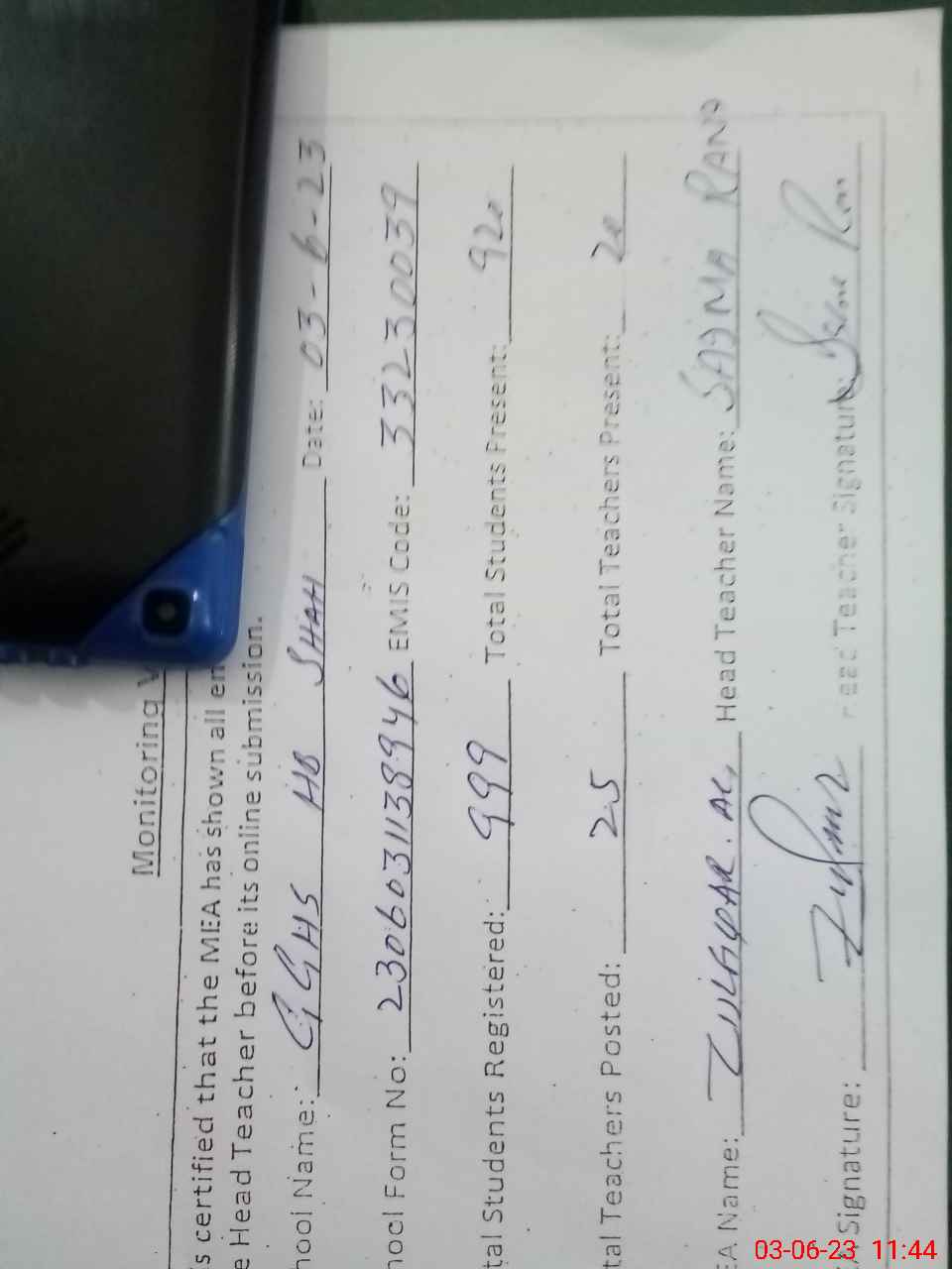 | Name: SA**** RA**** Designation: (School Headmaster's/Headmistress's) SST Phone/Cell Number: 03**** |