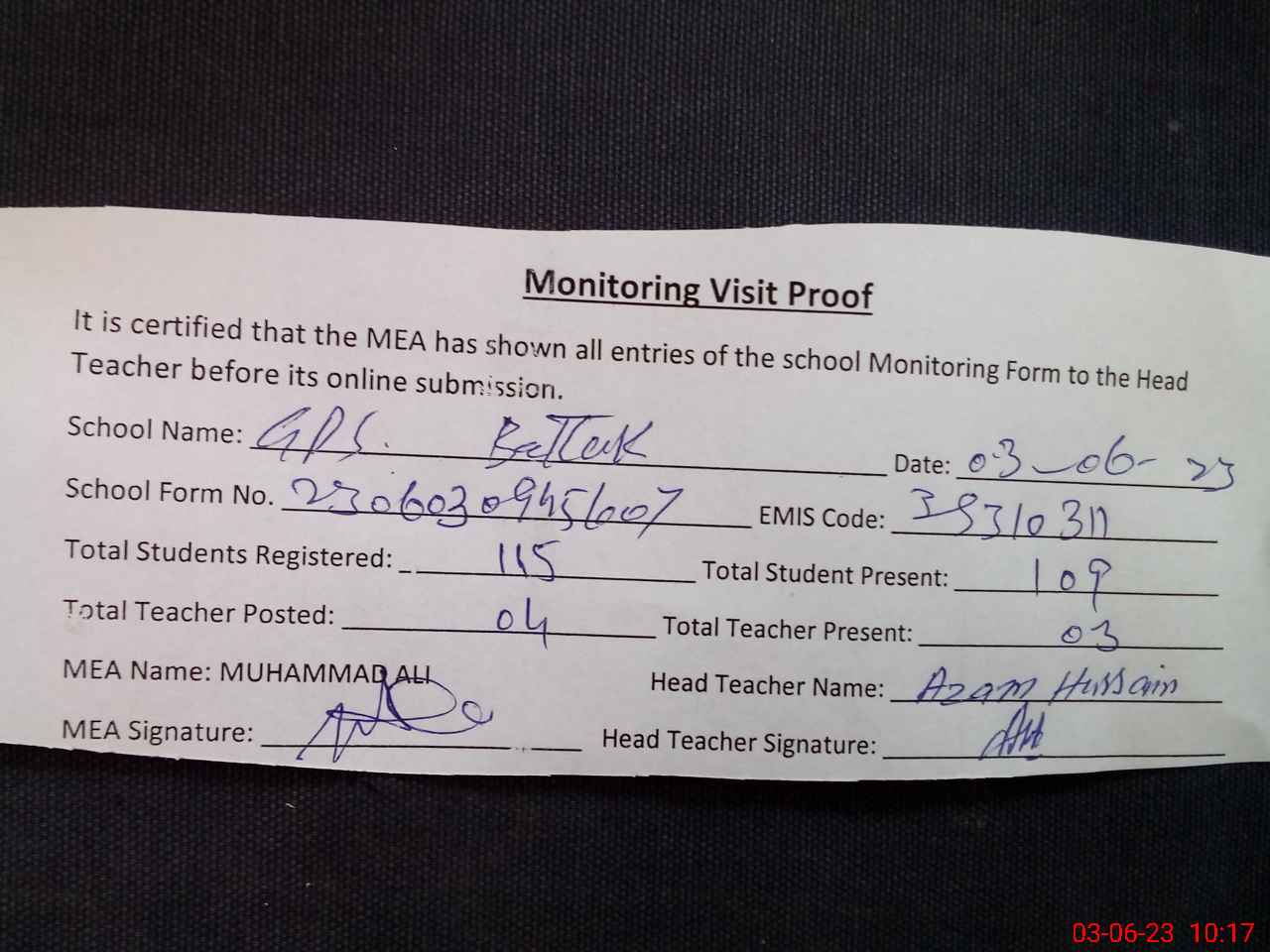 | Attendance Register | Head Teacher | MEA with School | Visit Proof |