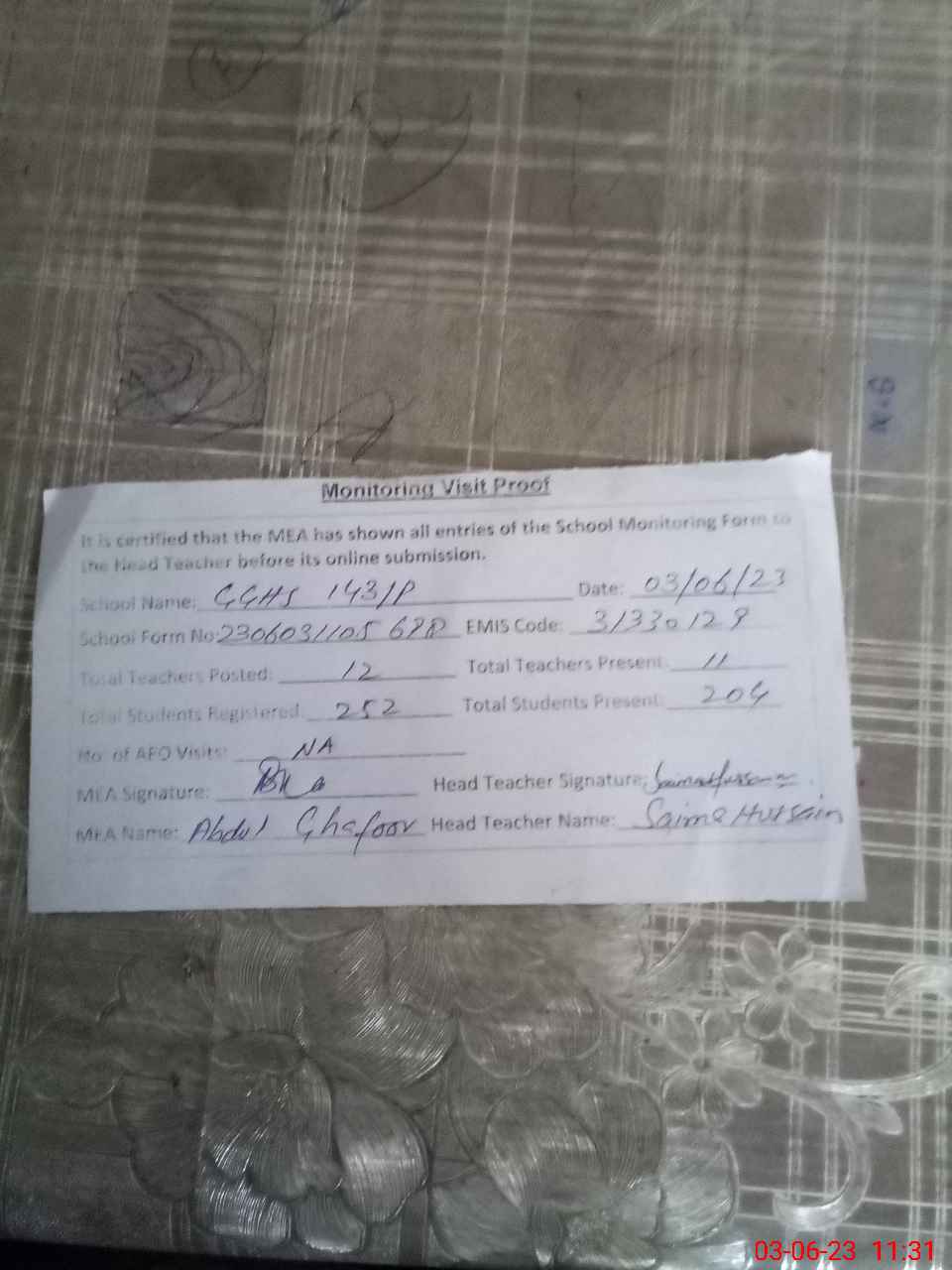 | Attendance Register | Head Teacher | MEA with School | Visit Proof |