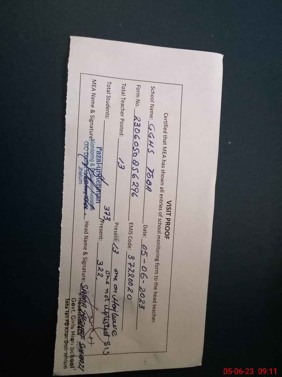 | Attendance Register | Head Teacher | MEA with School | Visit Proof |