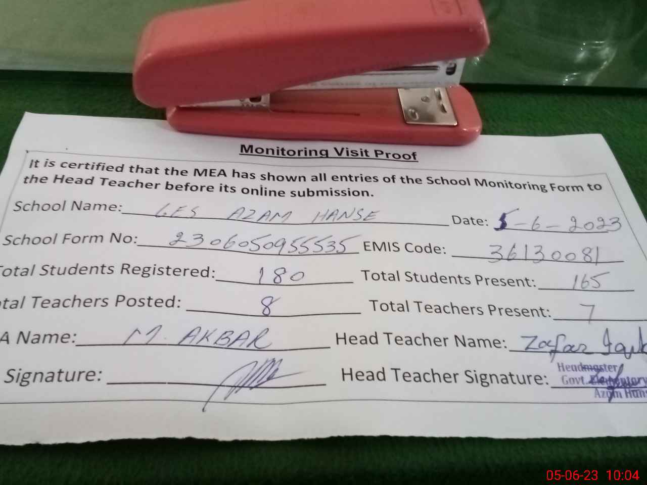 | Attendance Register | Head Teacher | MEA with School | Visit Proof |