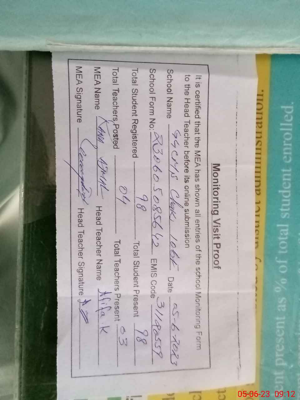 | Attendance Register | Head Teacher | MEA with School | Visit Proof |
