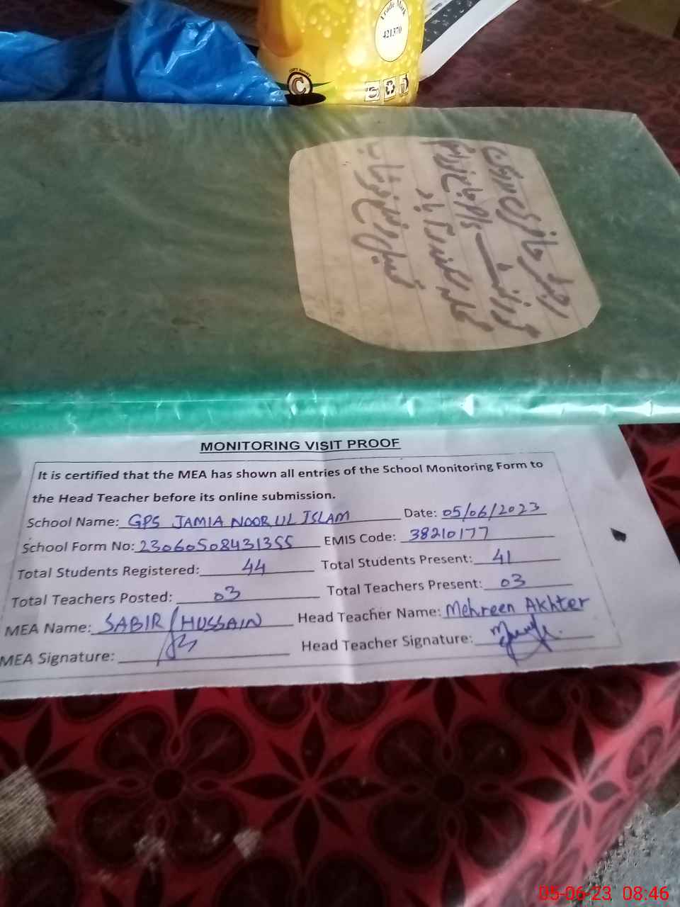 | EMIS Code: 38210177 | Name of School: GPS JAMIA NOOR UL ISLAM | |||