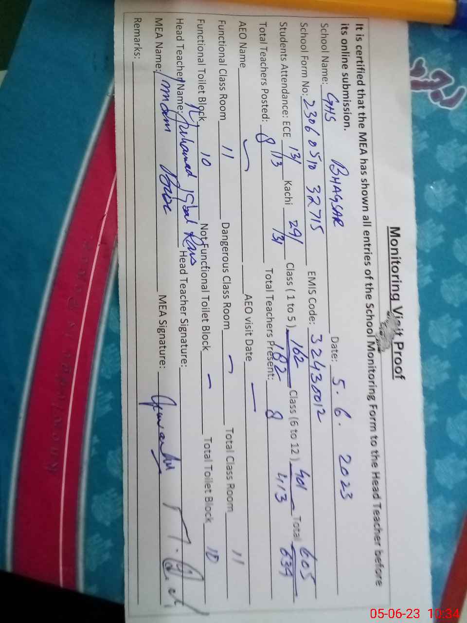| Attendance Register | Head Teacher | MEA with School | Visit Proof |