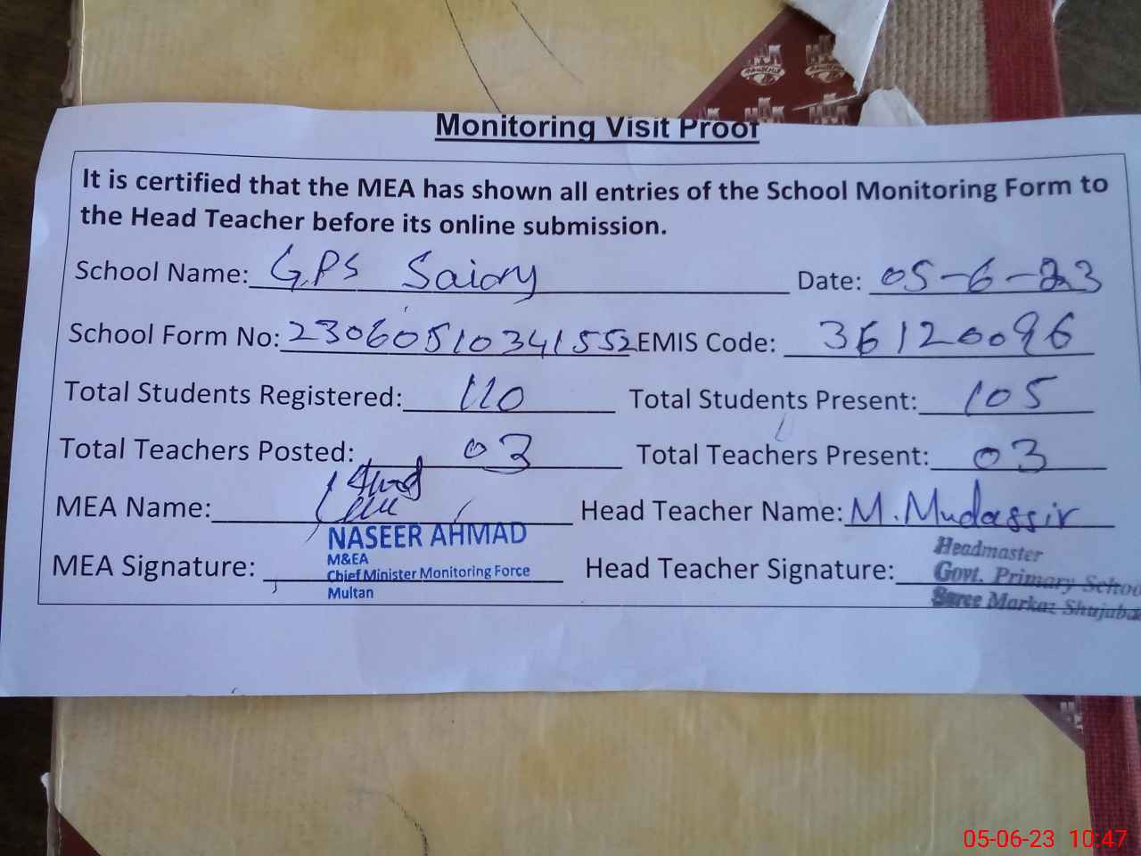 | EMIS Code: 36120096 | Name of School: GPS SAIRY P/O JALAL PUR KHAKHI | |||