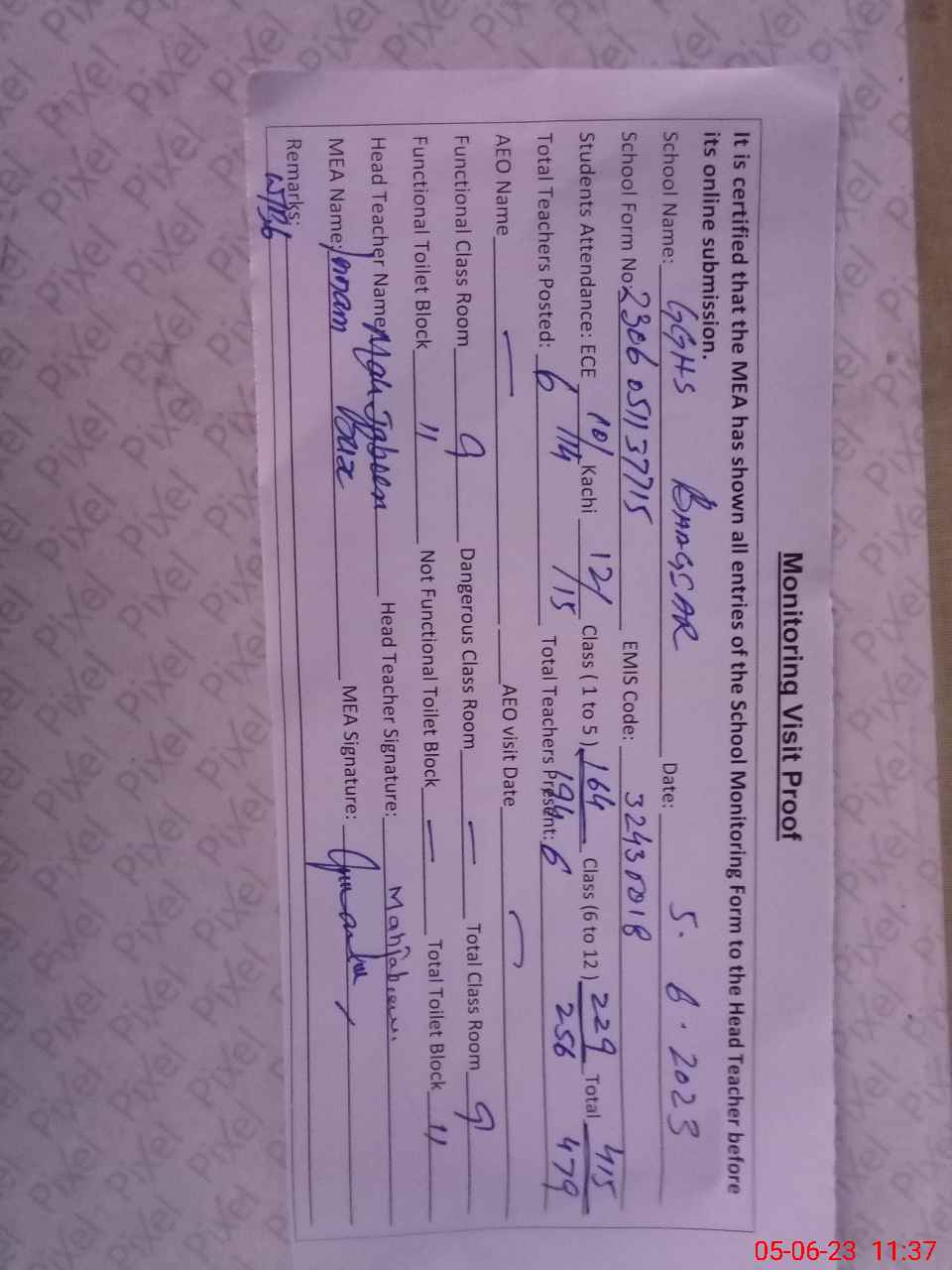 | Attendance Register | Head Teacher | MEA with School | Visit Proof |