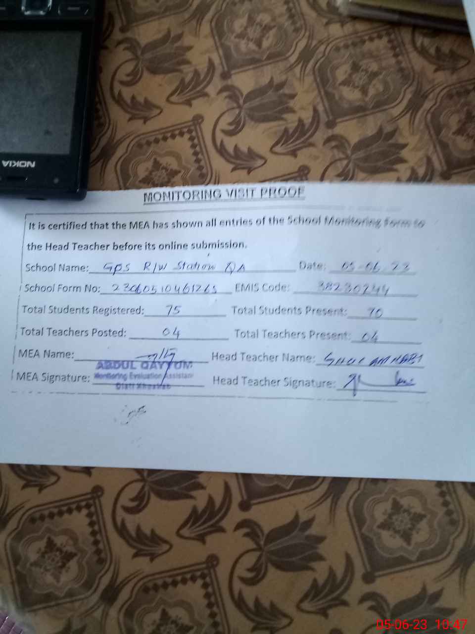 | Attendance Register | Head Teacher | MEA with School | Visit Proof |