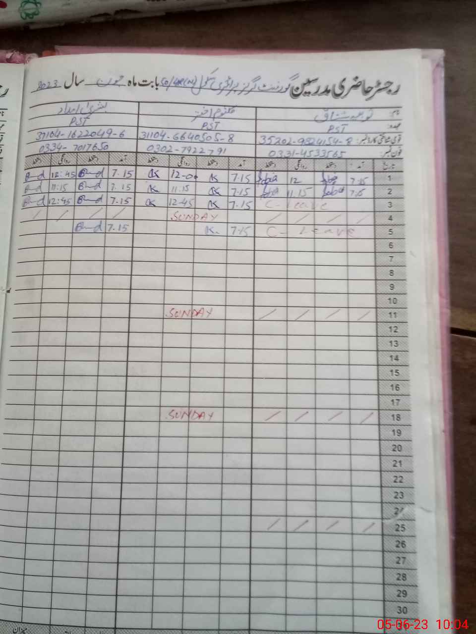 | CNIC | Full Name | Designation | R/C | Absence During Last Calender Month |