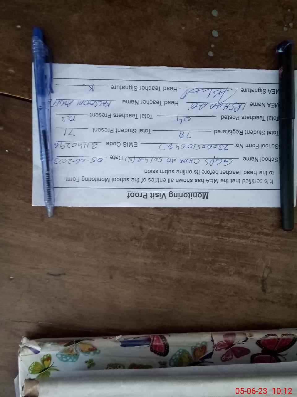 | Attendance Register | Head Teacher | MEA with School | Visit Proof |