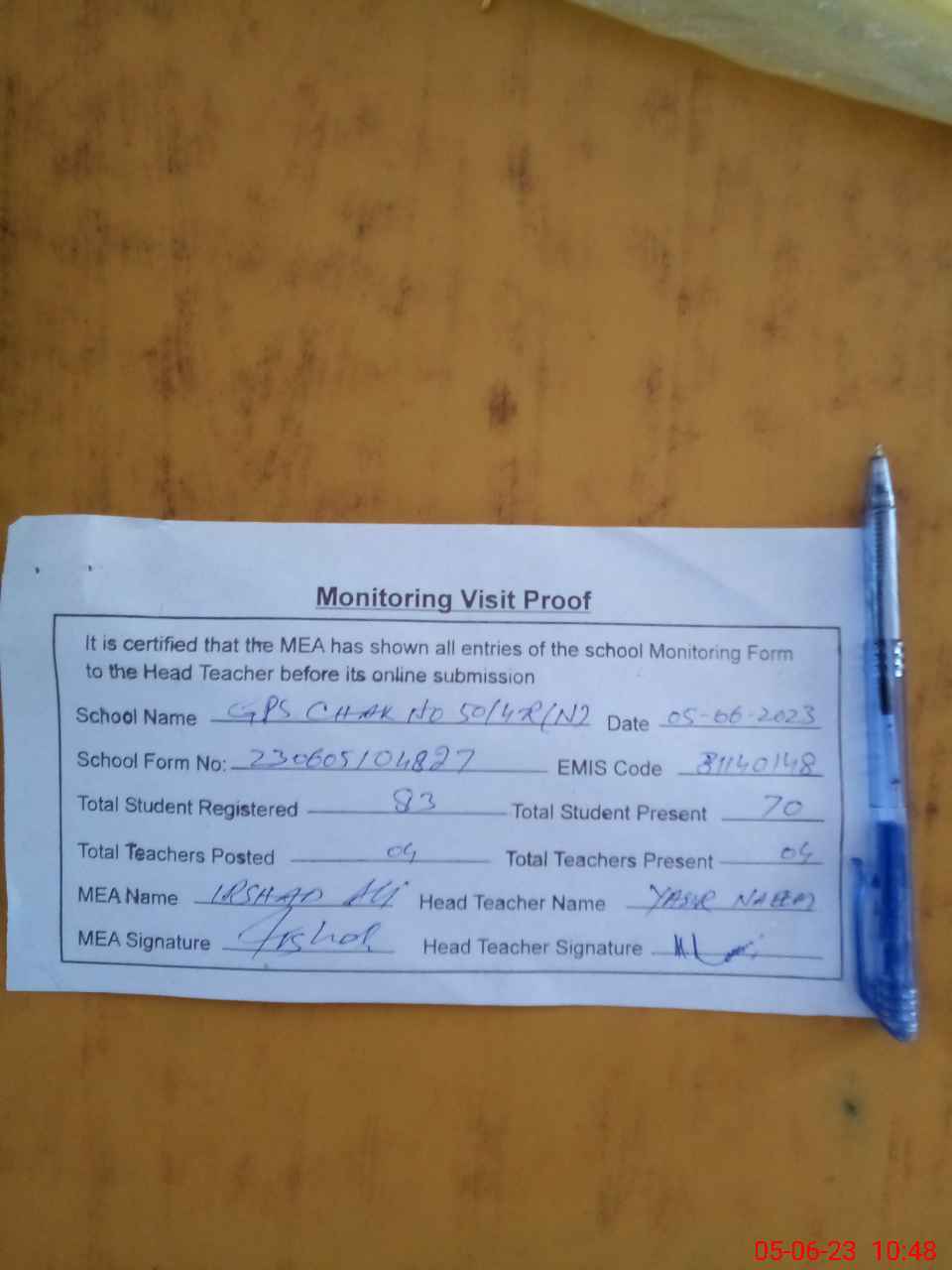 | Attendance Register | Head Teacher | MEA with School | Visit Proof |