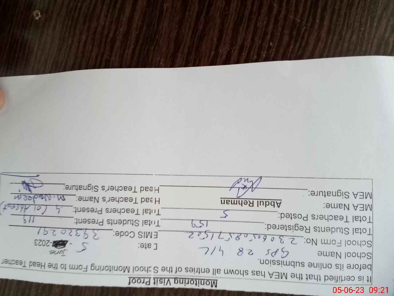 | Attendance Register | Head Teacher | MEA with School | Visit Proof |