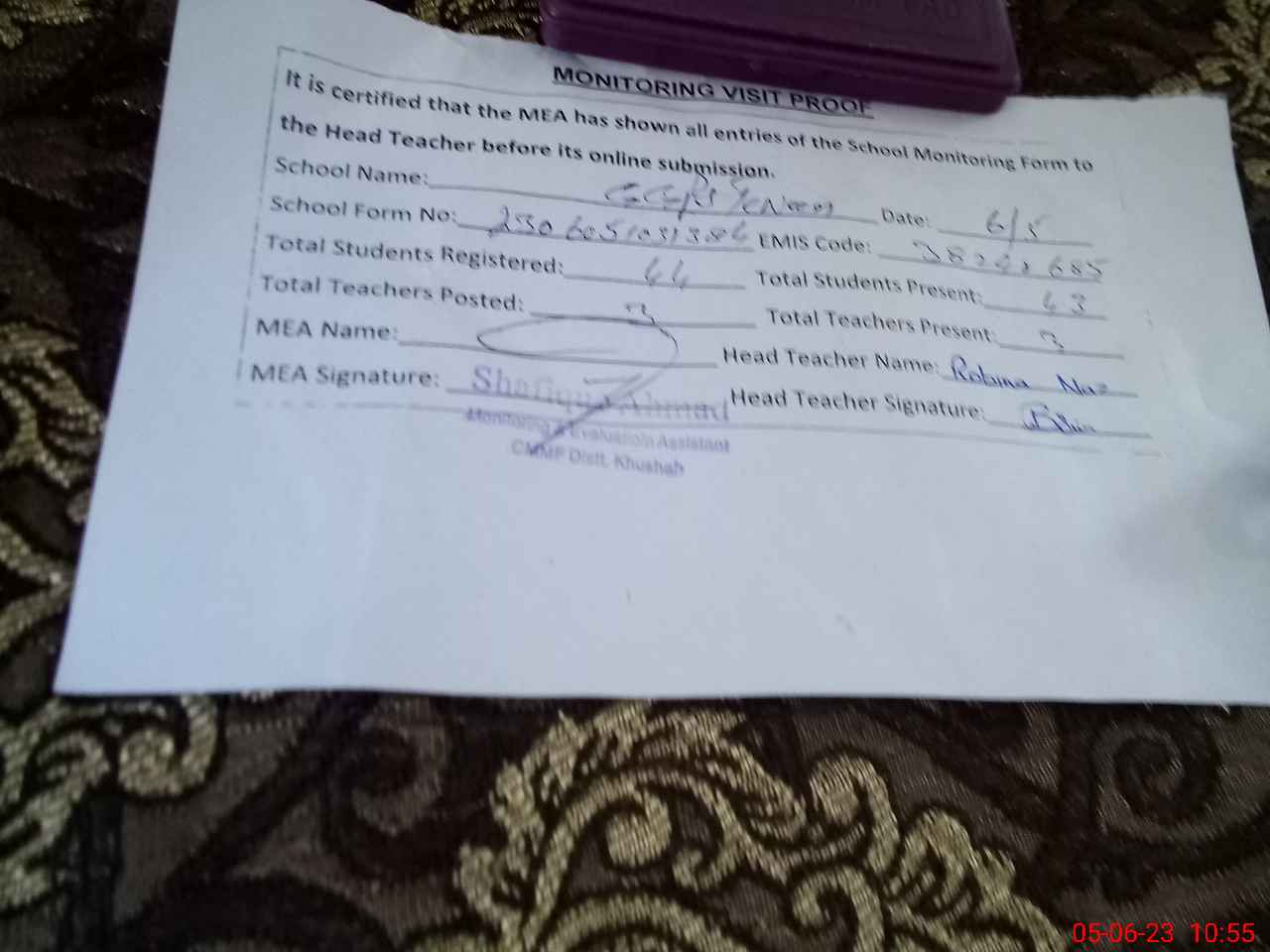 | Attendance Register | Head Teacher | MEA with School | Visit Proof |