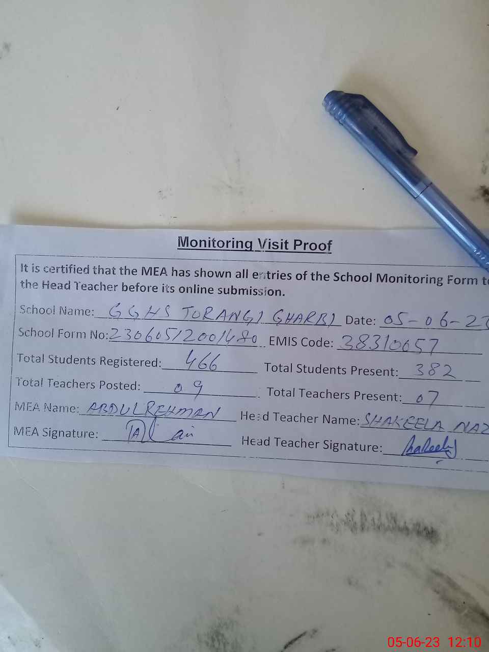 | Attendance Register | Head Teacher | MEA with School | Visit Proof |