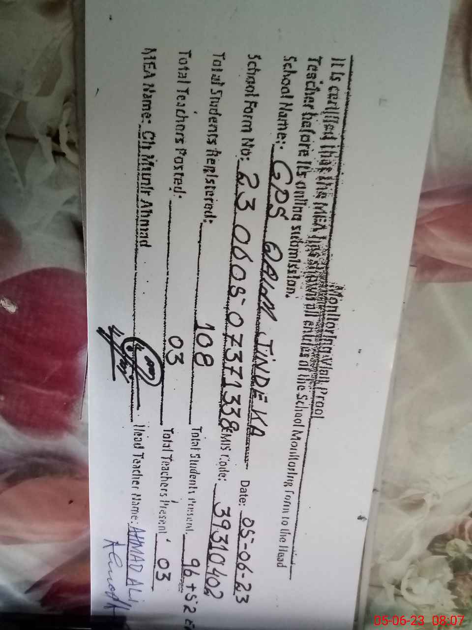 | Name: Mu**** Sh**** Designation: (School Headmaster's/Headmistress's) EST GEN Phone/Cell Number: 03**** |