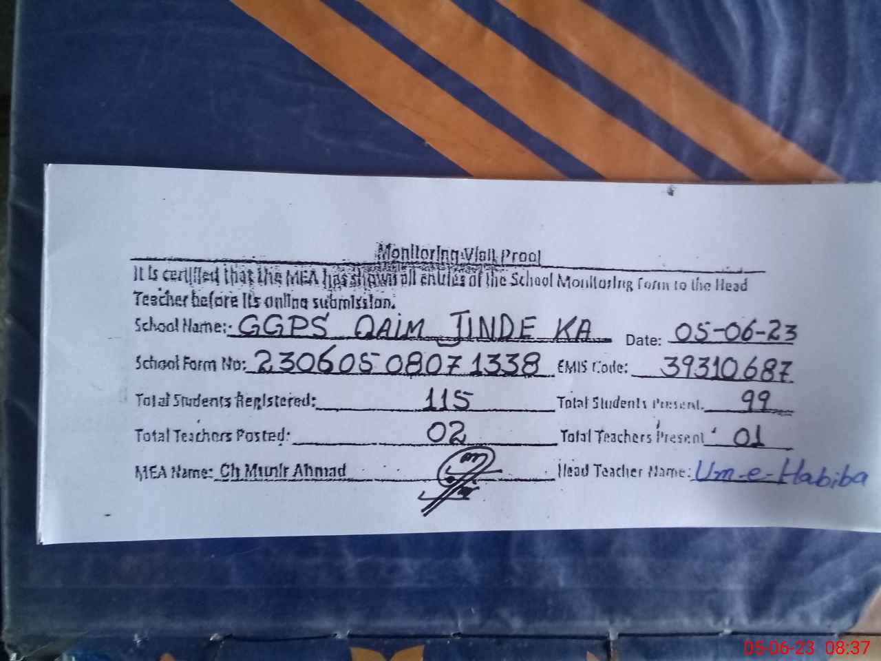 | Attendance Register | Head Teacher | MEA with School | Visit Proof |