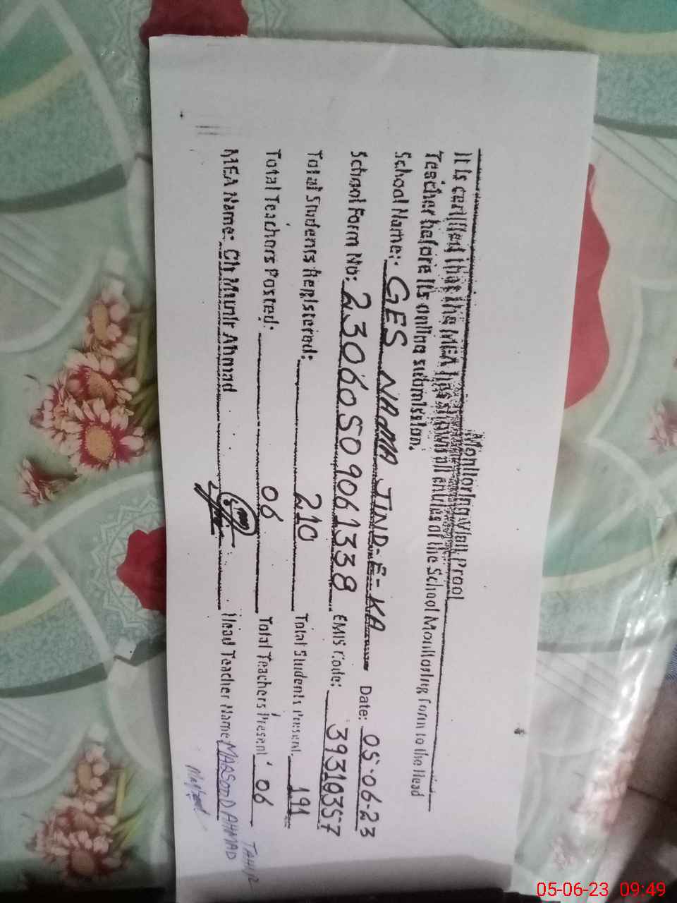 | Name: Mu**** Ah**** Ba**** Designation: (School Headmaster's/Headmistress's) Est Phone/Cell Number: 03**** |