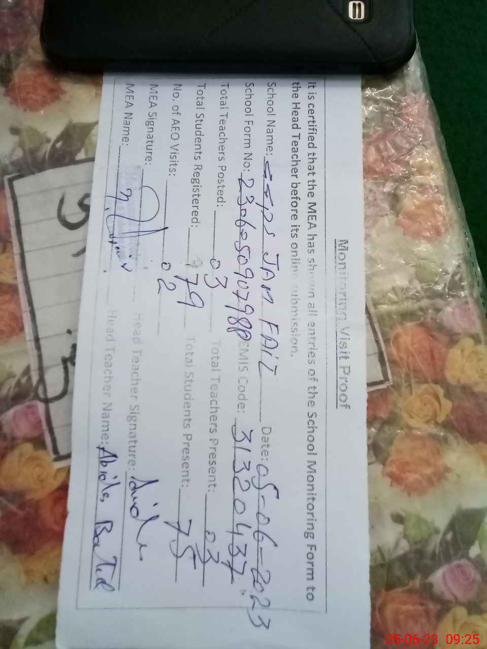 | Attendance Register | Head Teacher | MEA with School | Visit Proof |