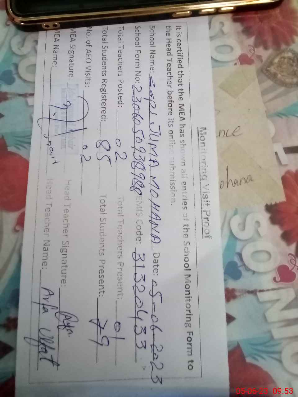 | Attendance Register | Head Teacher | MEA with School | Visit Proof |