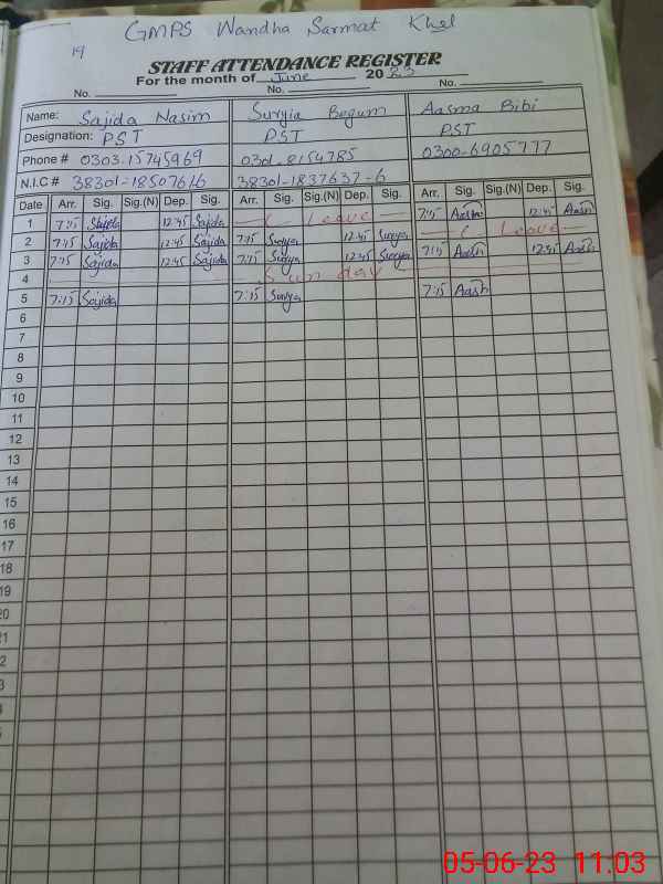 | CNIC | Full Name | Designation | R/C | Absence During Last Calender Month |
