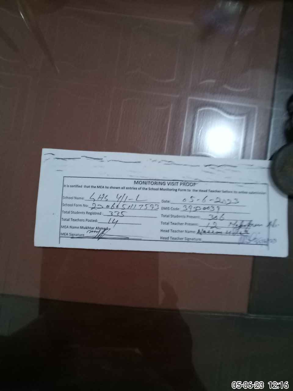 | Attendance Register | Head Teacher | MEA with School | Visit Proof |