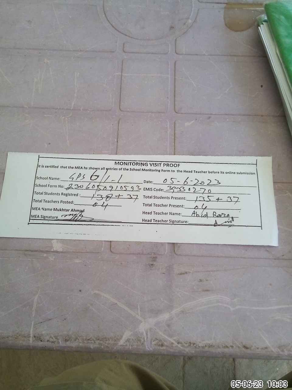 | Attendance Register | Head Teacher | MEA with School | Visit Proof |