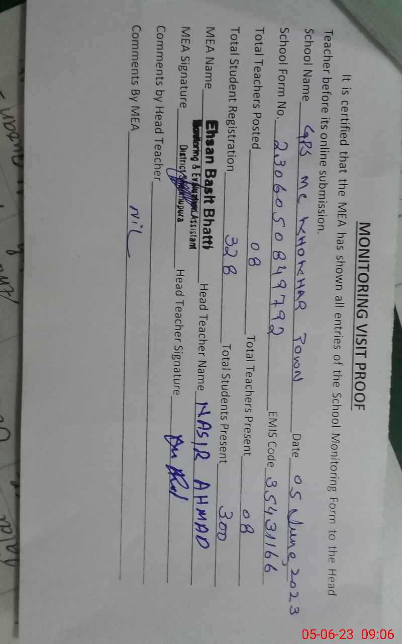 | EMIS Code: 35431166 | Name of School: GPS MC KHOKHAR TOWN | |||