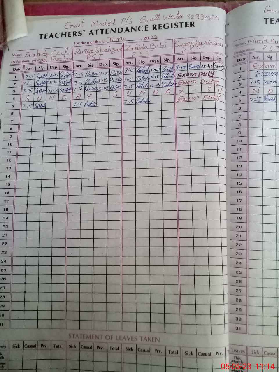 | 32**** | Su**** Na**** | PST | Regular | 0 | 0 | 0 | 0 | 0 | 0 | 0 | 0 | 0 | Exam Duty |
