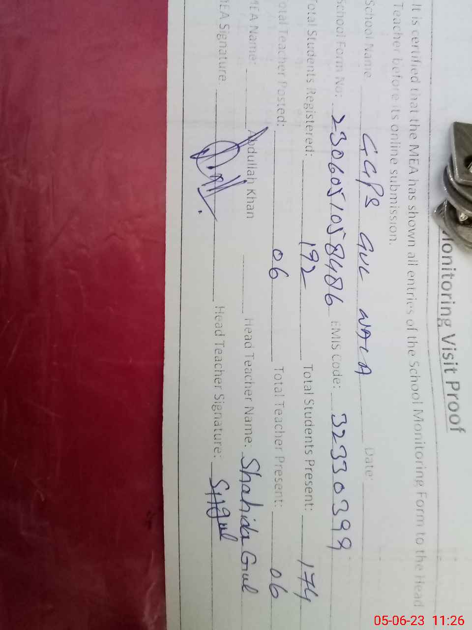| Attendance Register | Head Teacher | MEA with School | Visit Proof |