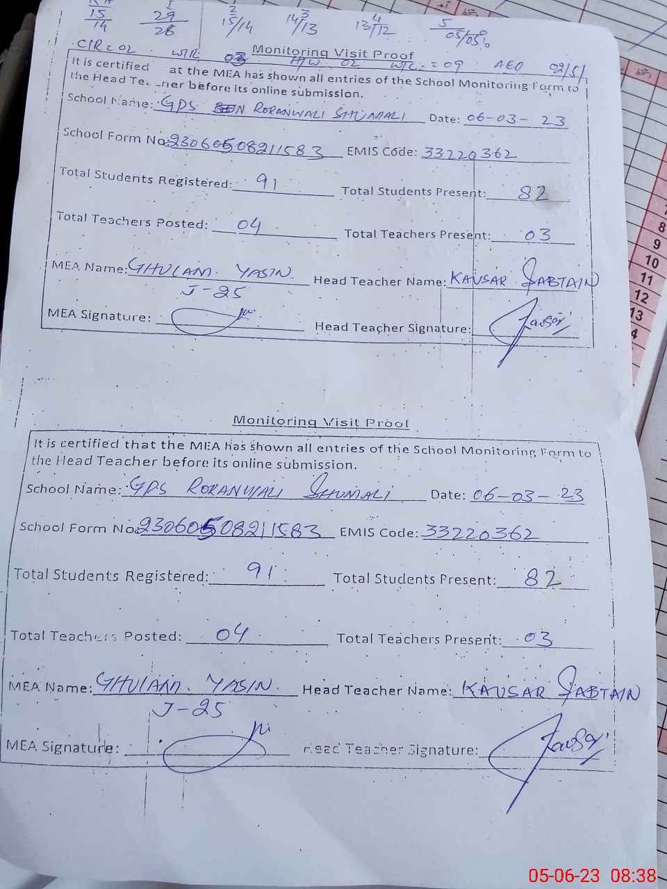 | Attendance Register | Head Teacher | MEA with School | Visit Proof |