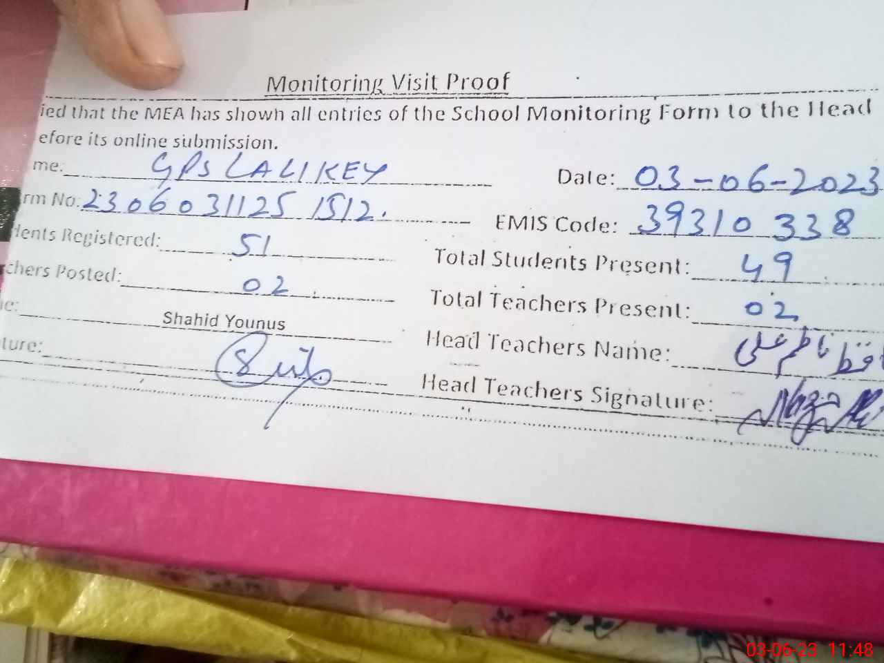 | Attendance Register | Head Teacher | MEA with School | Visit Proof |